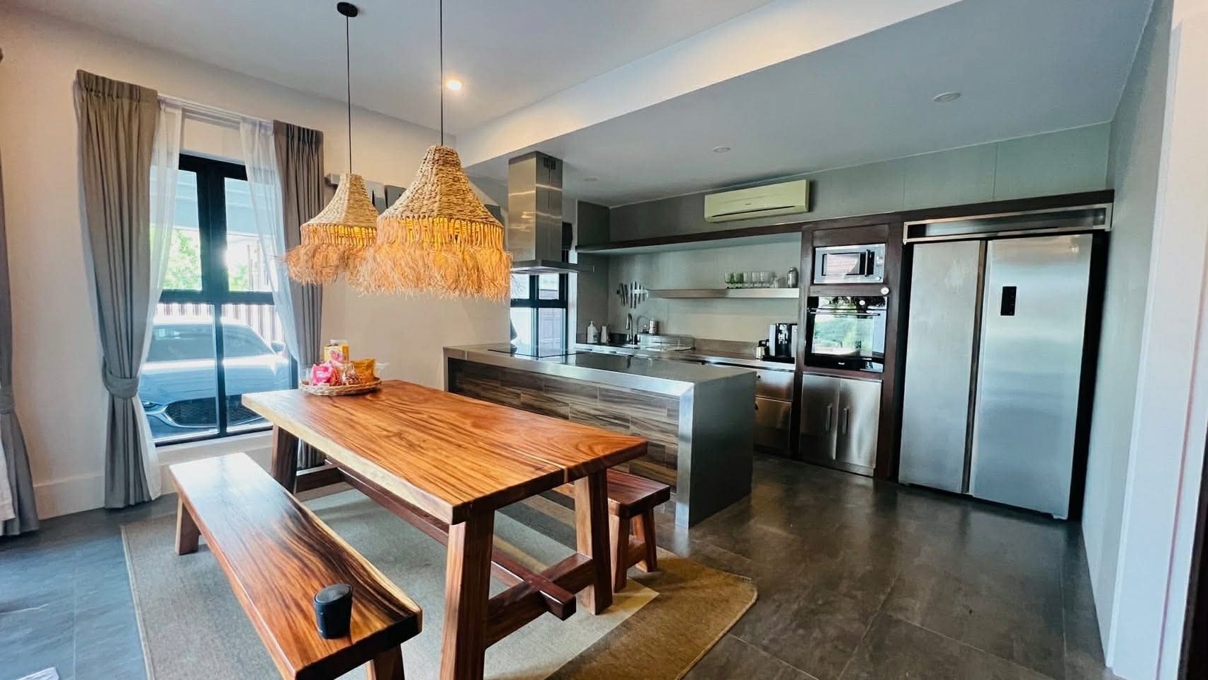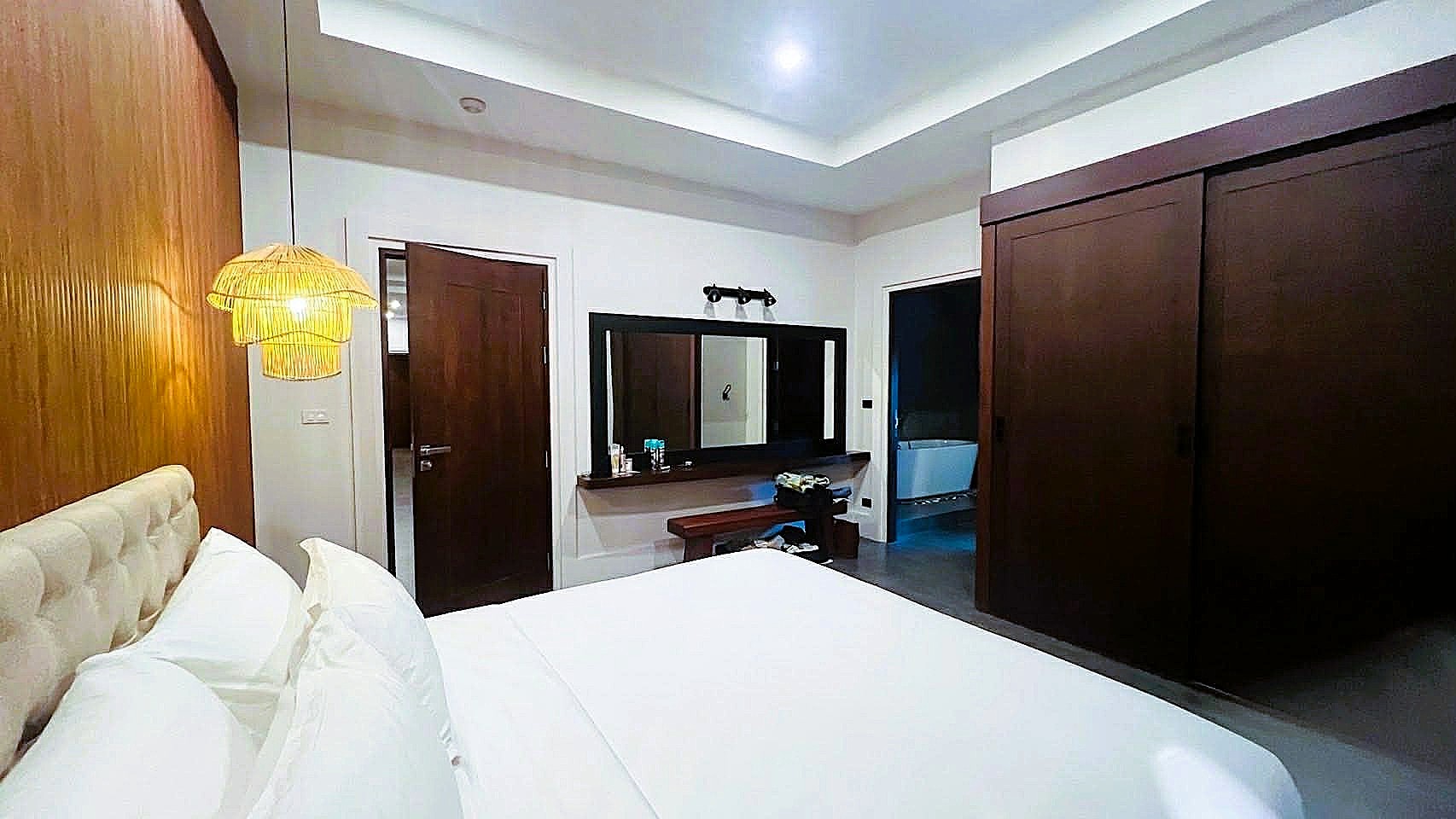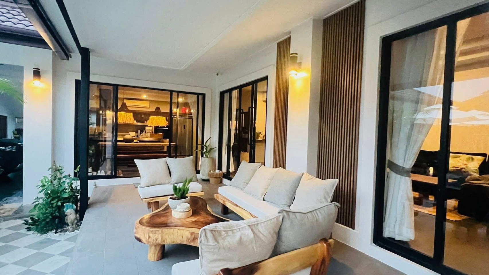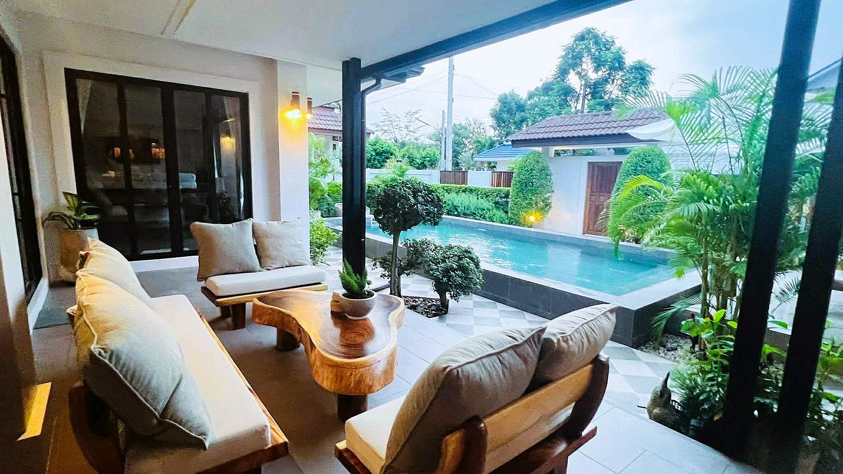 This Hua Hin pool villa rental features a unique Bali-inspired design, combining indoor-outdoor living with elegant furnishings and generous usable space.